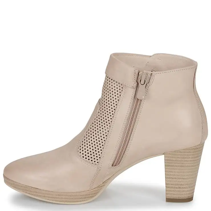 Botín elaborado en piel picada, detalle en el tobillo. Cierre con cremallera lateral interna. Suela de goma, plantilla de piel y tacón de 9 cm de altura.