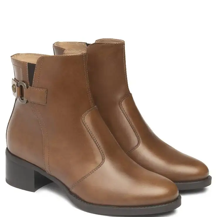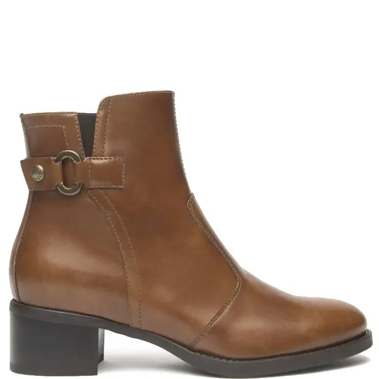 Botín elaborado en piel. Detalle de anilla metálica. Suela de goma y tacón bloque de 4 cm de altura. Plantilla extraíble de PU DryGo® y función Memory. Cierre con cremallera lateral.