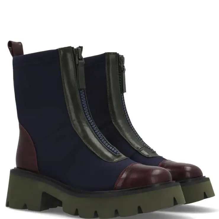 Botín elaborado en material sintético y textil. Punta redondeada. Cremallera central. Suela track de goma de 4,7 cm de altura.