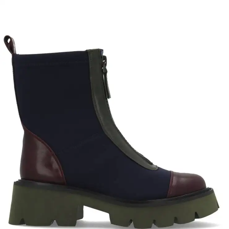 Botín elaborado en material sintético y textil. Punta redondeada. Cremallera central. Suela track de goma de 4,7 cm de altura.