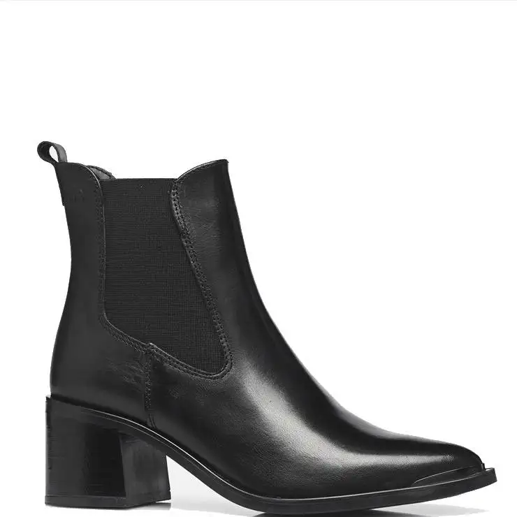 Botín estilo campero elaborado en piel lisa. Punta fina y estilizada con detalle metálico. Suela de goma y tacón cuadrado de 6,0 cm. Plantilla suave con Touchit. Elásticos en los laterales para facilitar el calce.