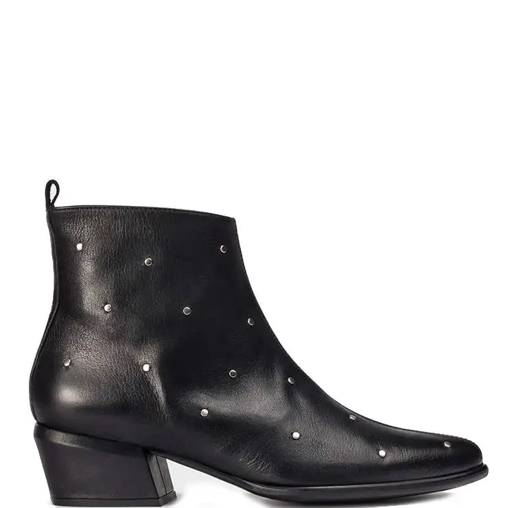 Botín elaborado en piel con microtachas metálicas. Cierre con cremallera lateral interior. Puntera afilada. Suela flexible de cuerolite con tacón de 5,5 cm de altura.