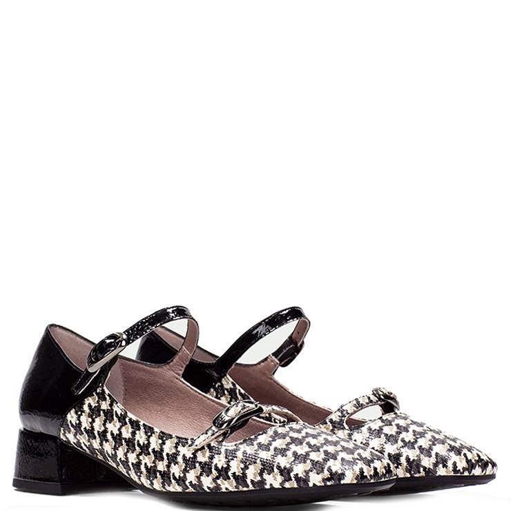 Merceditas elaborada en charol y material textil de pata de gallo. Punta cuadrada. Tiras ajustables con hebillas en el empeine. Suela de goma con tacos. Tacón ancho de 3 cm. Forro 100% transpirable y termorregulador. Plantilla con Tecnología Triflow.