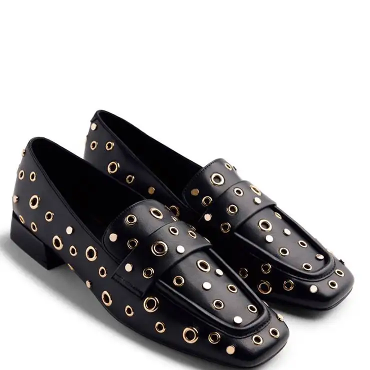 Mocasín de piel con ollados y tachas en acabado dorado. Punta cuadrada. Planta acolchada y detalle de antifaz. Suela de caucho flexible y tacón ancho de 2,5 cm de altura.