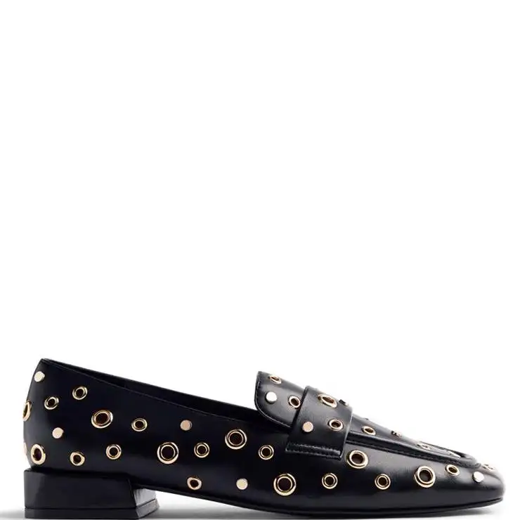 Mocasín de piel con ollados y tachas en acabado dorado. Punta cuadrada. Planta acolchada y detalle de antifaz. Suela de caucho flexible y tacón ancho de 2,5 cm de altura.