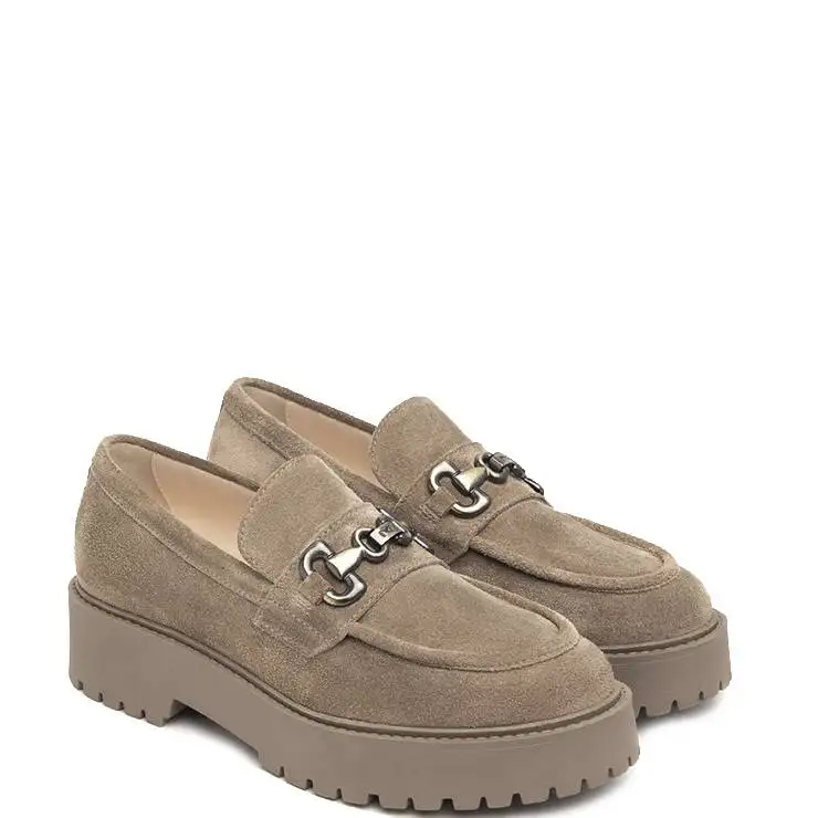 Mocasín elaborado en ante. Suela de goma dentada de 4 cm de altura. Detalle metálico en el empeine.