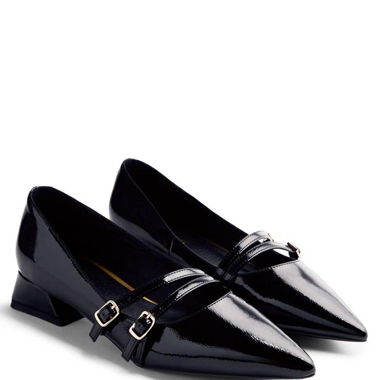 Salón de PU con acabado efecto charol. Punta afilada. Planta acolchada. Suela de caucho flexible y tacón bloque de 3 cm. Cierre ajustables con finas hebillas en el empeine.
