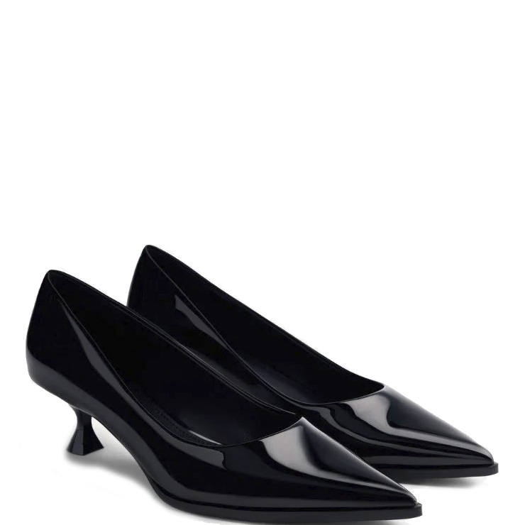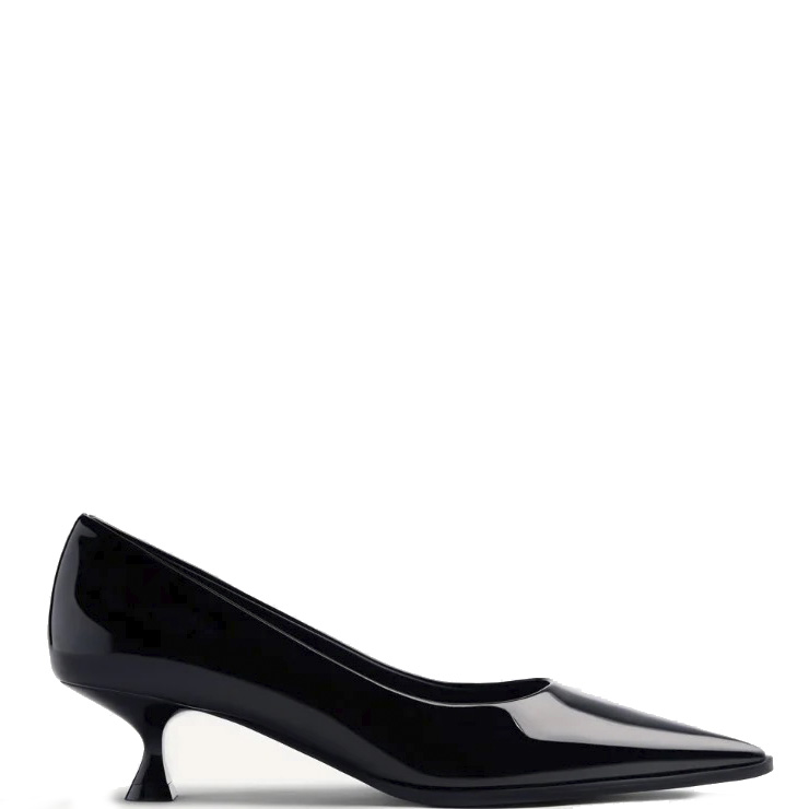 Salón con acabado en efecto charol. Punta afilada. Planta acolchada. Suela de caucho flexible y tacón bajo tipo kitten de 4 cm.