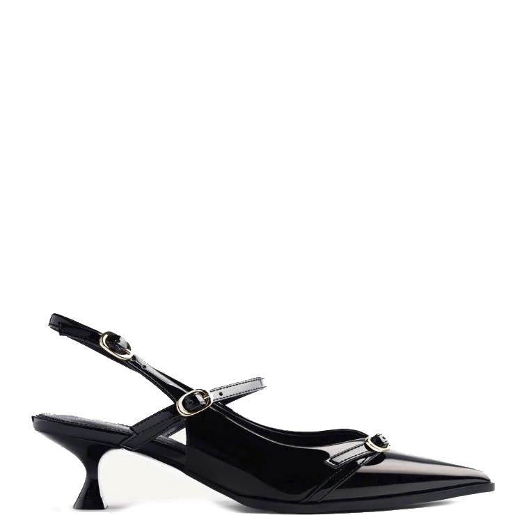 Salón destalonado con acabado en efecto charol. Detalle de hebillas. Punta afilada. Cierres ajustables y planta acolchada. Suela de caucho flexible y tacón bajo de 4 cm.