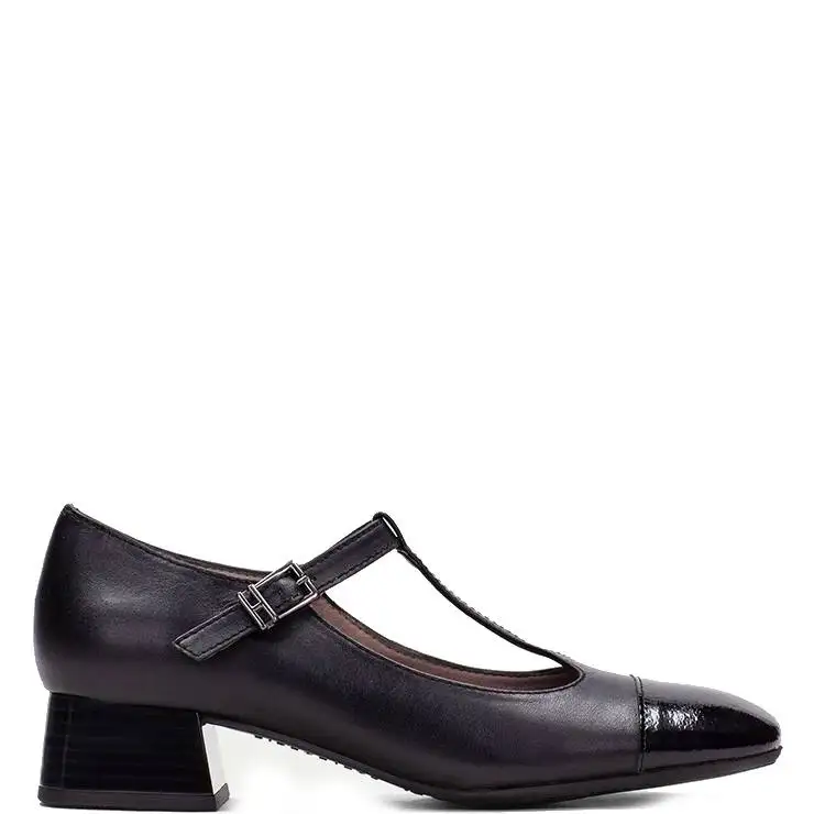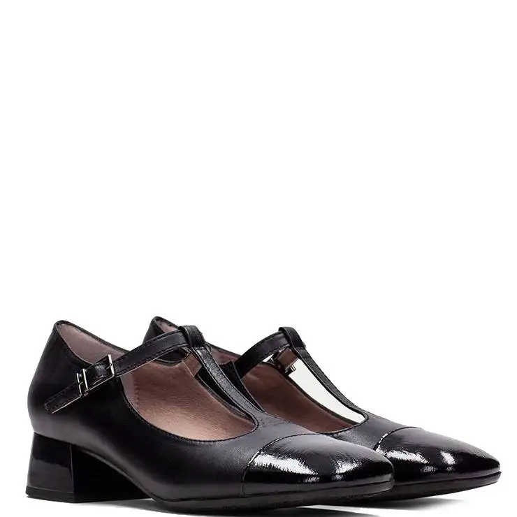 Zapato de piel tipo salón t-strap con punta ligeramente cuadrada. Tacón y punta con toque acharolado. Tacón bloque de 3,5 cm. Cierre de hebilla en el lateral estilo Mary Jane. Tecnología Triflow de triple almohadillado.