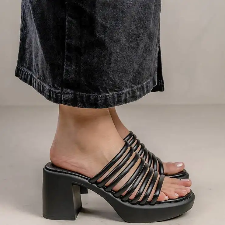 Sandalia multi tiras elaboradas en piel. Suela de goma ligera con plataforma y tacón de 8 cm. Planta acolchada en piel.