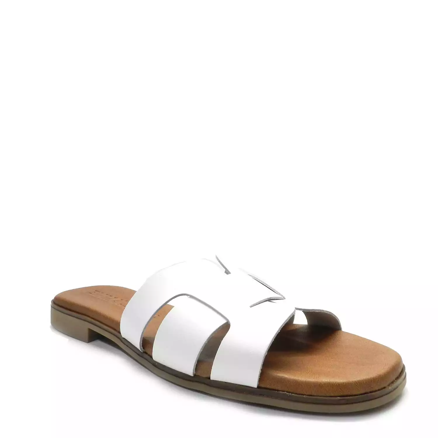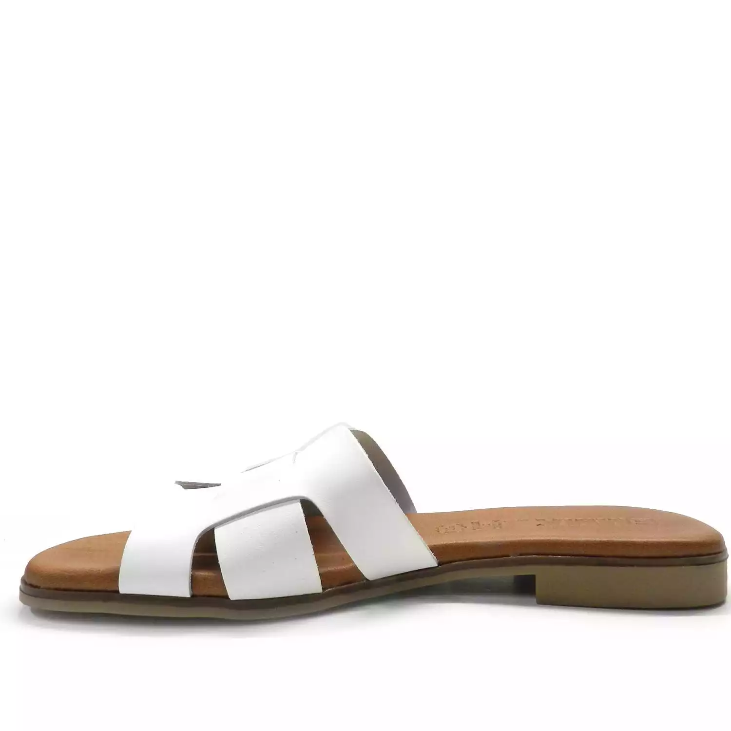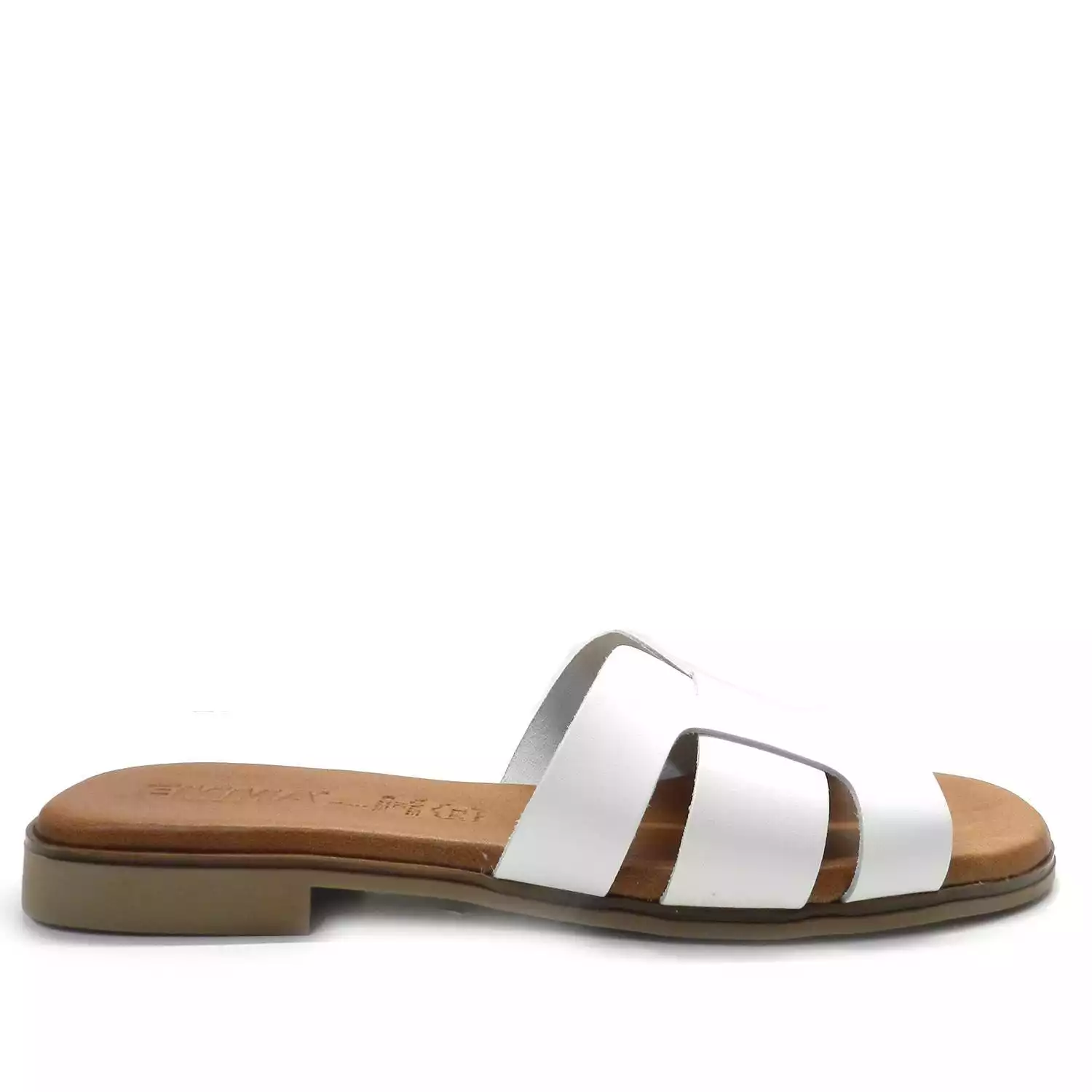 Sandalia de la marca Escala modelo Sacalm en color blanco. Sandalia plana tipo pala de piel lisa. Banda ancha entrelazada y planta acolchada de piel. Muy cómoda y perfecta para cualquier ocasión.