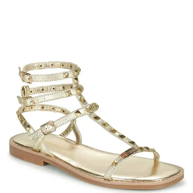 Sandalia plana estilo romana con finas tiras en piel dorada con tachuelas cuadradas. Cierre con multi hebilla.
