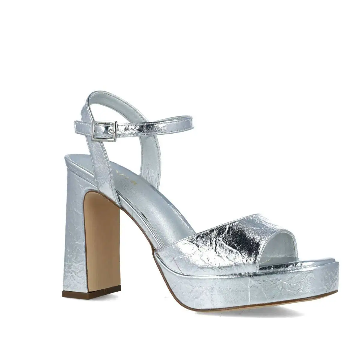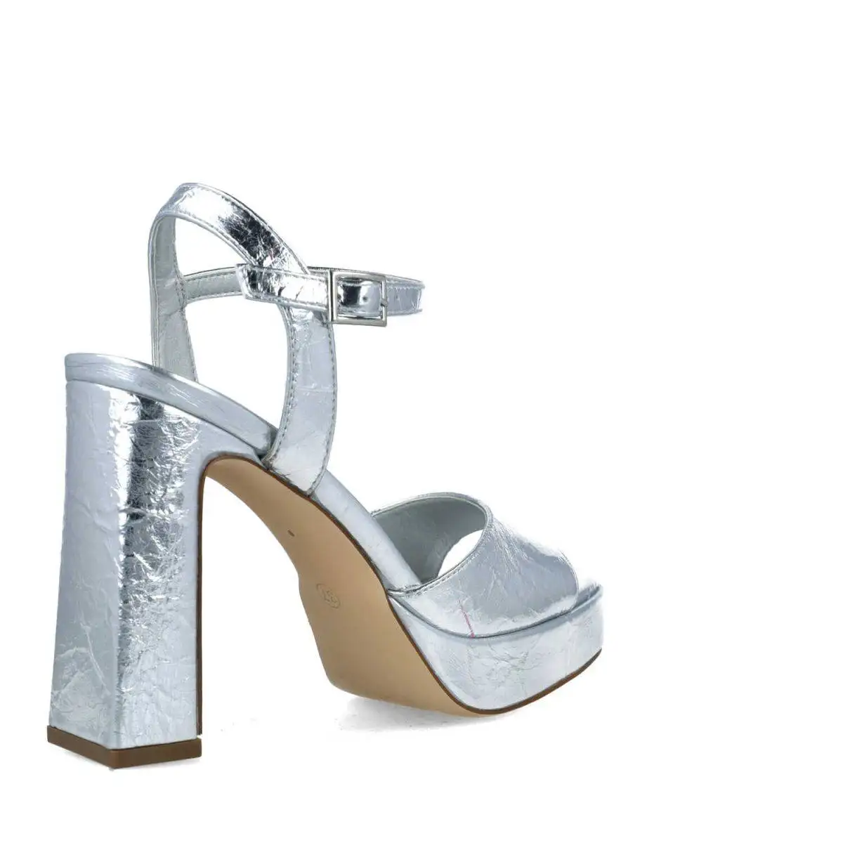 Sandalia de tacón alto elaborada en napa rugosa metalizada. Pala en la parte delantera y tira con cierre de hebilla en el tobillo.