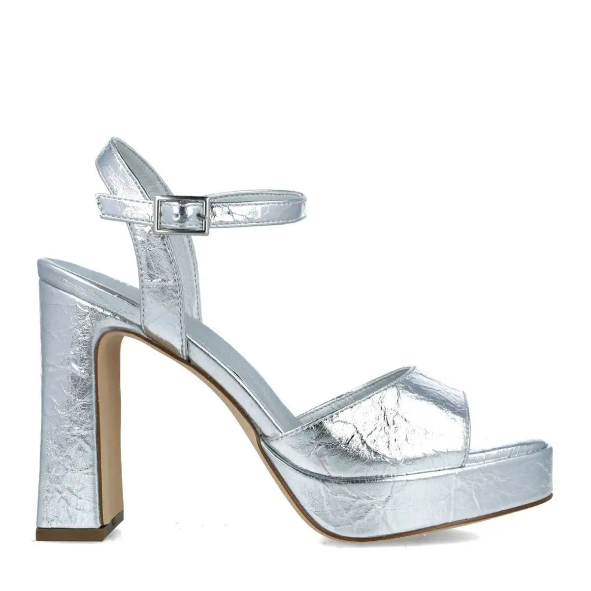 Sandalia de tacón alto elaborada en napa rugosa metalizada. Pala en la parte delantera y tira con cierre de hebilla en el tobillo.