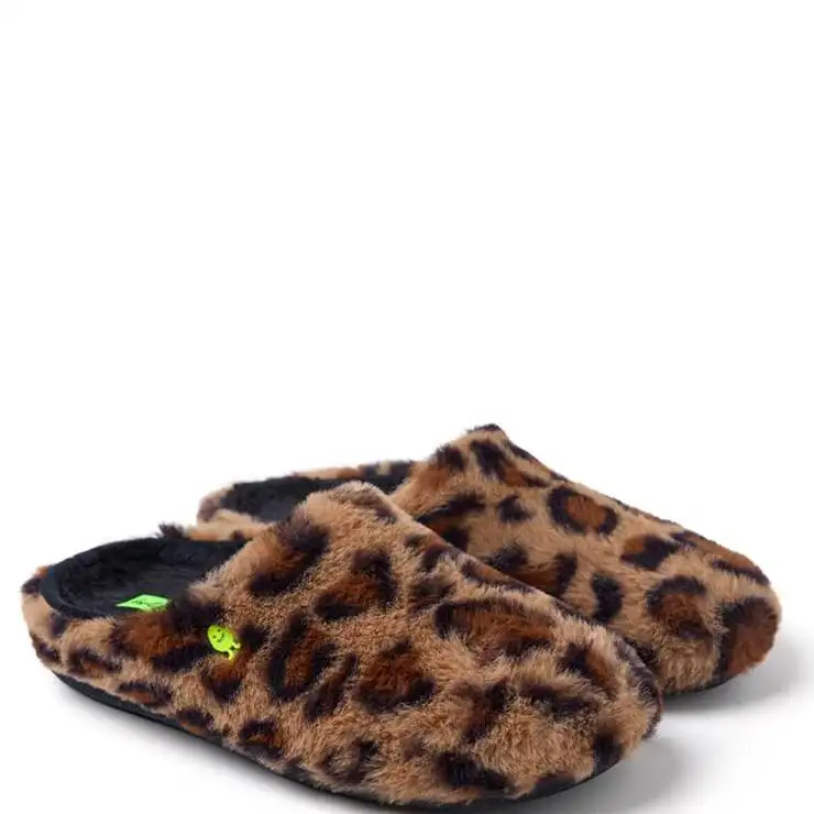Zapatillas de casa destalonadas de pelo con estampado de leopardo. Plantilla de pelo, acolchada y extraíble. Suela flexible 75% caucho natural con virutas de EVA reciclada.