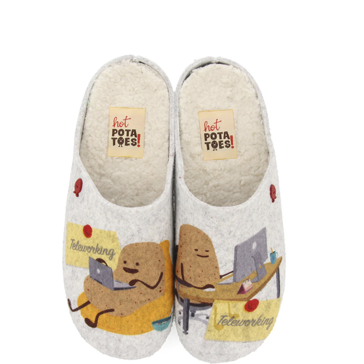 Zapatillas de casa tipo babucha de fieltro PET reciclado. Estampado con la famosa “patatilla” estilo “teletrabajo”. Planta de material suave. Plantilla extraíble de espuma de poliuretano 100% reciclado. Suela de caucho natural.
