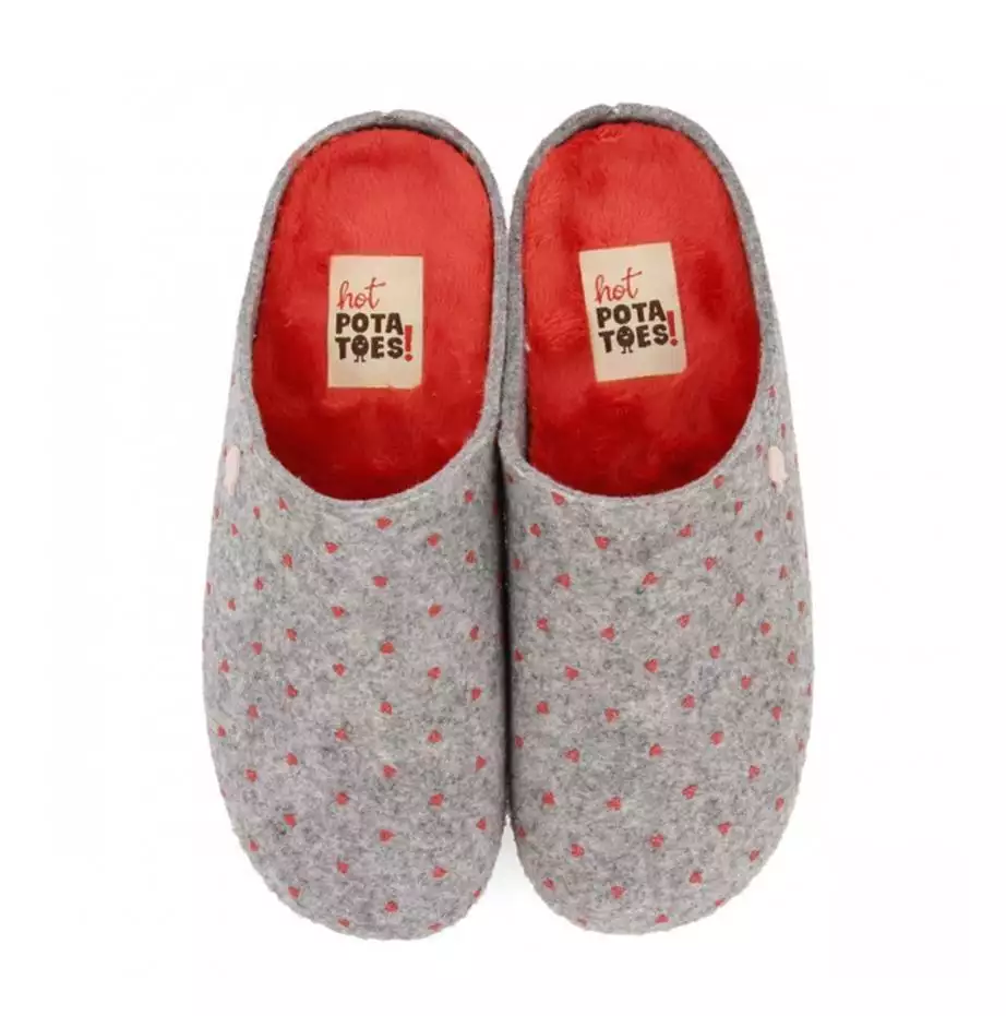 Zapatillas casa de la marca Gioseppo modelo Hittisau en rojo. Gioseppo de la colección Hot Potatoes. Zapatillas de casa tipo babucha en color gris con estampado de topos rojos e interior en color rojo. Corte en fieltro PET recilado, ribete de tejido poliéster suave. Planta afelpada de tejido suave. Plantillas extraíbles de espuma. Suela de caucho natural.