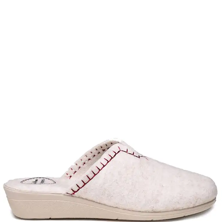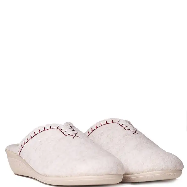 Zapatillas de casa tipo zueco elaboradas en fieltro reciclado. Suela de goma EVA antideslizante en cuña de 4 cm de altura. Planta interior acolchada. Detalle de bordado en contraste.