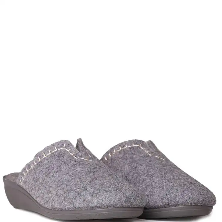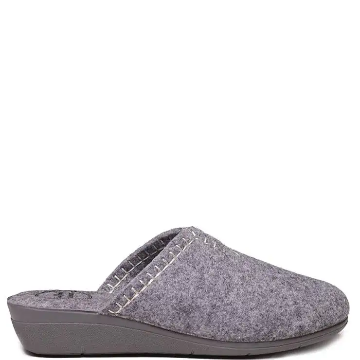 Zapatillas de casa tipo zueco elaboradas en fieltro reciclado. Suela de goma EVA antideslizante en cuña de 4 cm de altura. Planta interior acolchada. Detalle de bordado en contraste.