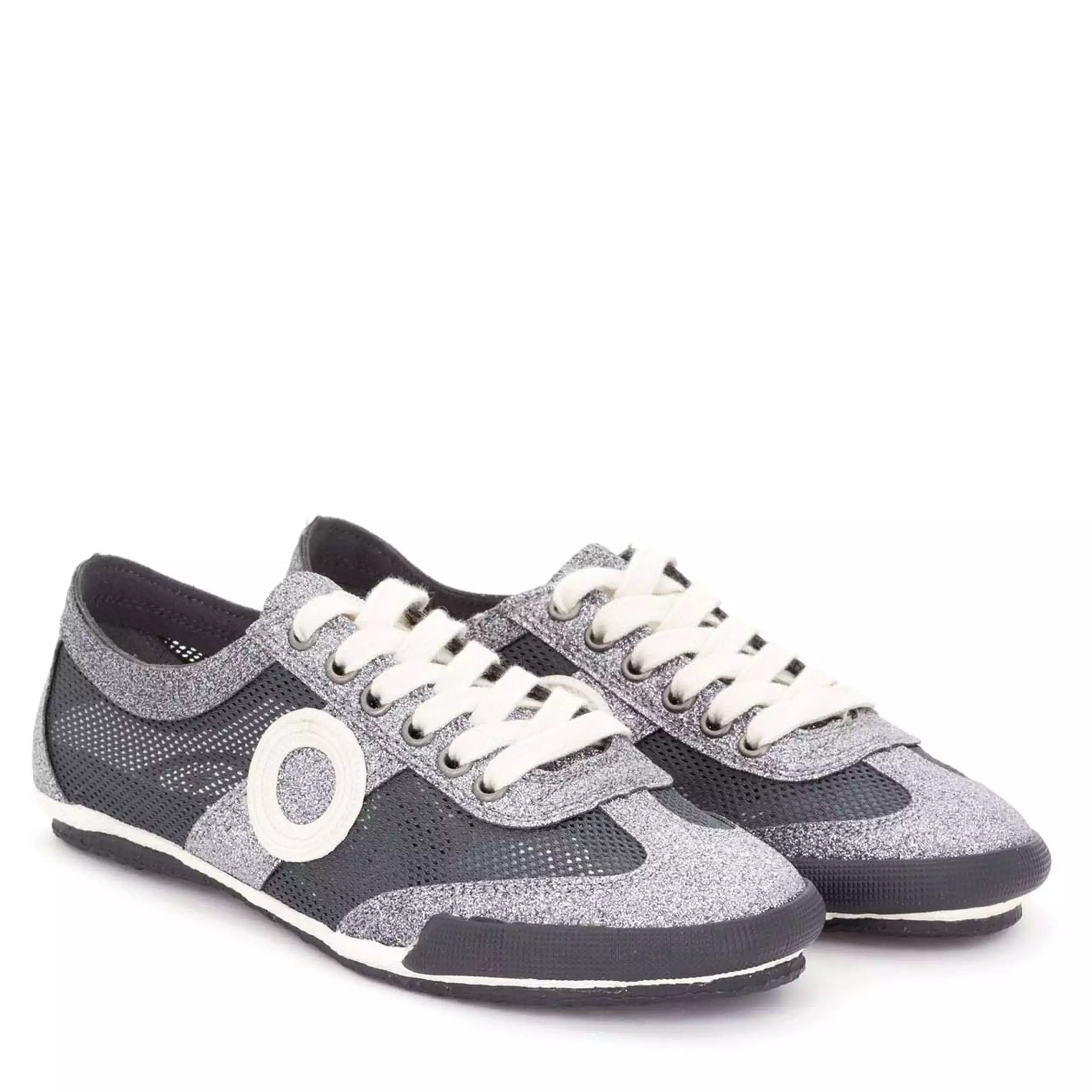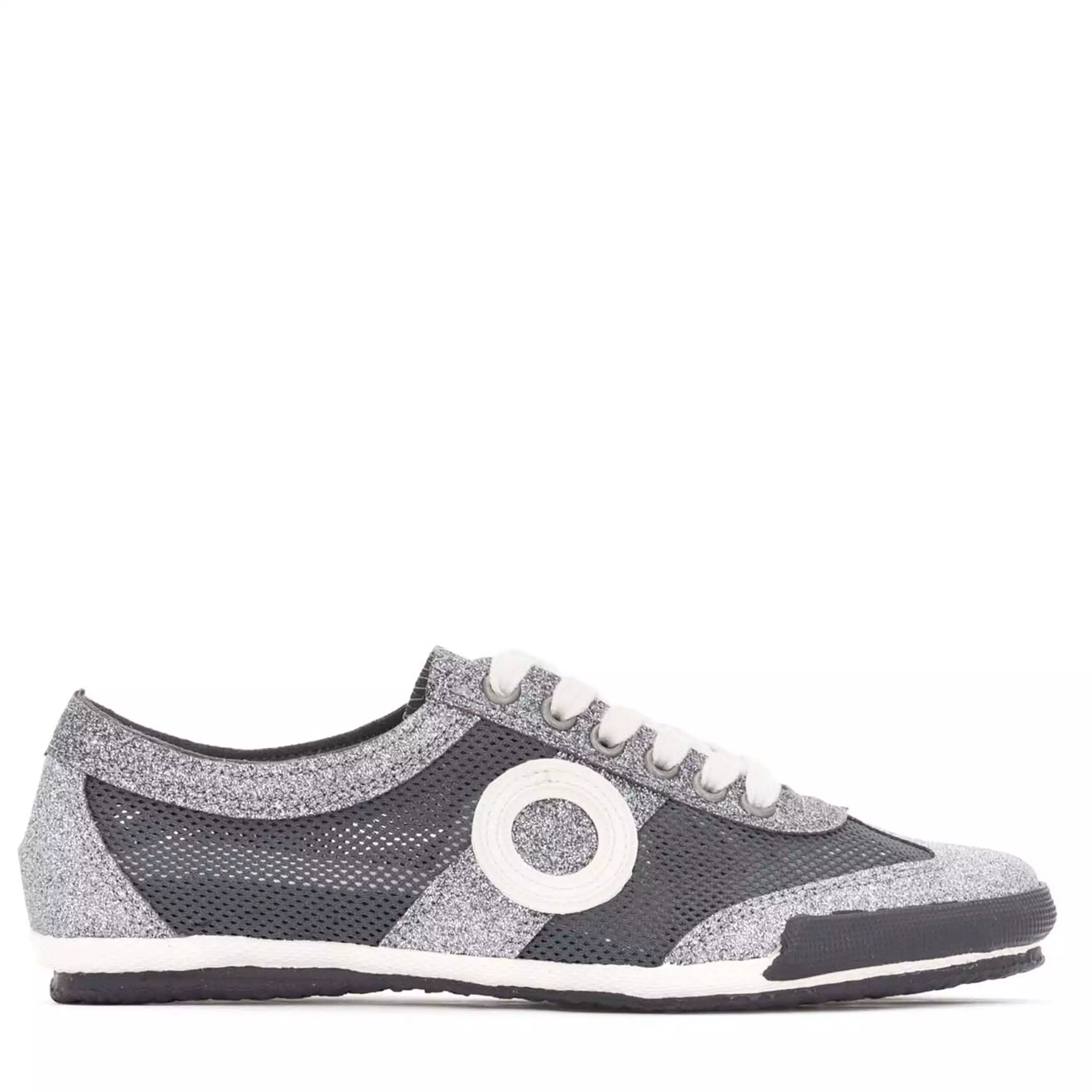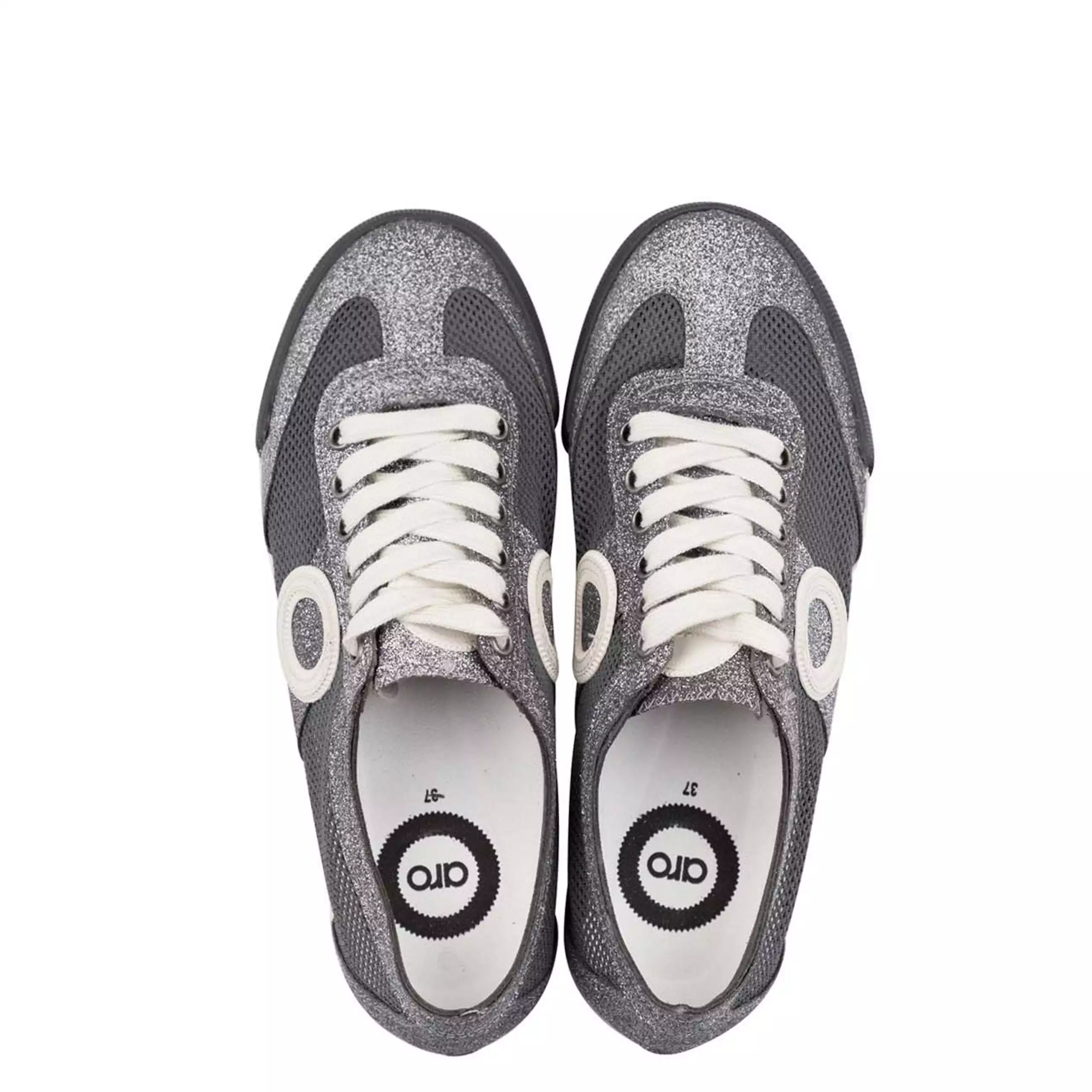 Zapatillas de la marca Aro, modelo Joaneta 3133 en Glitter Old Silver. Zapatillas deportivas en combinación de malla de poliéster y microfibra en color plomo con acabado brillante. Suela de goma natural 100% y cierre con cordones de algodón.