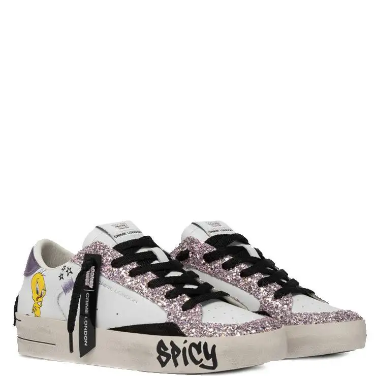 Zapatillas deportivas en cuero blanco con brillo lavanda y estampado de Tweety Bird, detalles de gamuza negra. Cordones negros. Etiqueta de goma negra individual. Suela de 2,5- 3,5 cm de piel sintética con estampado de grafiti y acabado vintage.