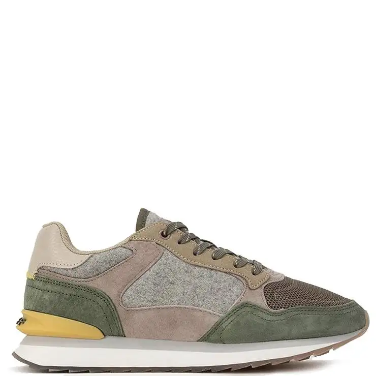 Zapatillas deportivas con cordones formada por piezas cortadas combinando diferentes materiales en diferentes tonalidades. Rejilla en poliéster transpirable. Plantilla extraíble de memory foam. Media suela de EVA de 3 cm de altura. Patín dentado en goma transparente con imagen serigrafiada.