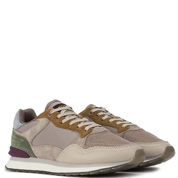 Zapatillas deportivas con cordones formada por piezas cortadas combinando diferentes materiales en diferentes tonalidades. Rejilla en poliéster transpirable. Plantilla extraíble de memory foam. Media suela de EVA de 3 cm de altura. Patín dentado en goma transparente con imagen serigrafiada.
