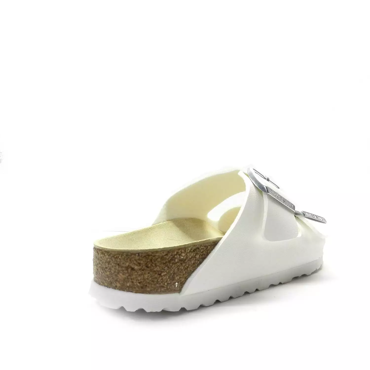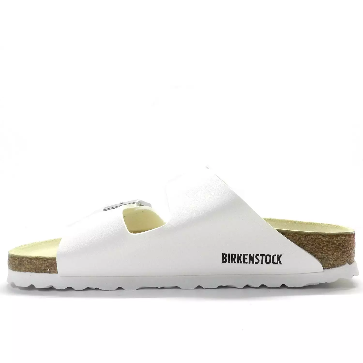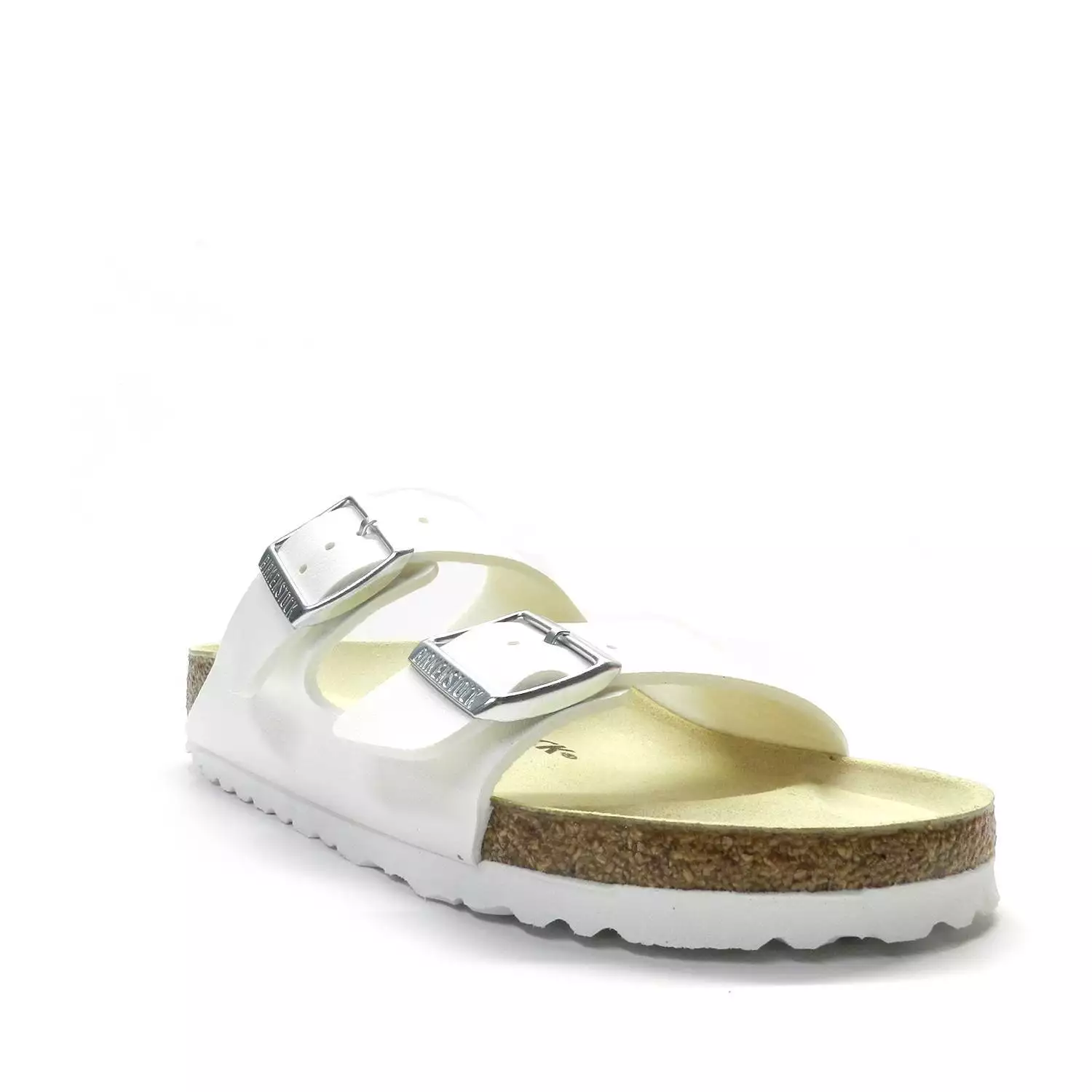 Sandalia de la marca Birkenstock modelo Arizona BS en color blanco. Sandalia de dos correas, cada una con una hebilla de espiga de metal y ajuste individual realizadas en Birko-Flor®, lleva plantilla en ante y suela EVA.