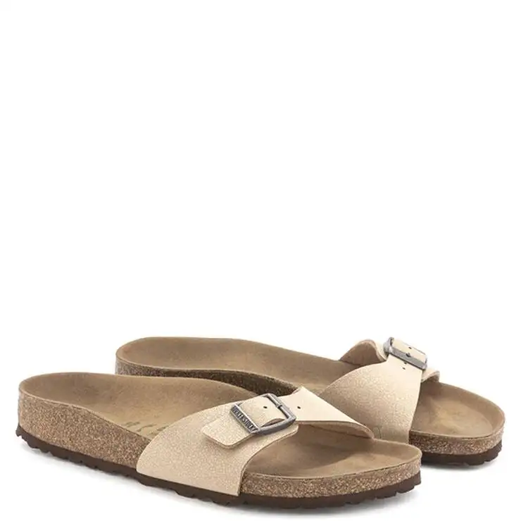 Sandalia elaborada en Birko-Flor Nubuck. Detalle correa con una hebilla de espiga metálica con ajuste individual. Base de corcho y látex de forma anatómica. Suela de goma EVA. Suela interna de microfibra.