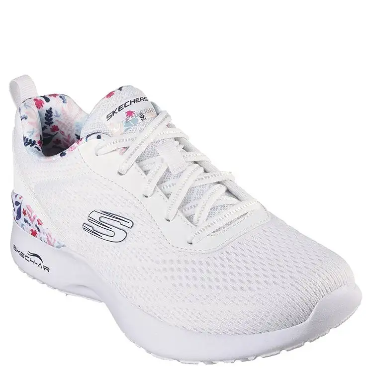 Zapatillas deportivas elaboradas en malla y tejido sintéticos con ribete de estampado floral. Plantilla Skechers Memory Foam . Media suela con cámara de aire Skech-Air. Suela de goma flexible con tracción.