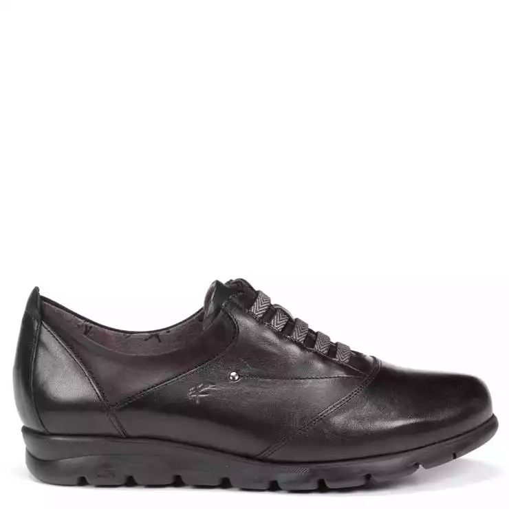 Zapatos de la marca Fluchos, modelo 32268 en color negro. Zapatos fabricados en napa lisa con cordones elásticos y suela dentada. Un básico que aporta comodidad y confort para el día a día.