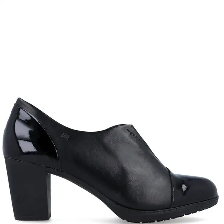 Zapato abotinado elaborado en piel detalle en punta y talón en charol. Elástico en el empeine. Forro interior. Plantilla microfibra transpirable. Suela de goma con tacón de 6 cm.