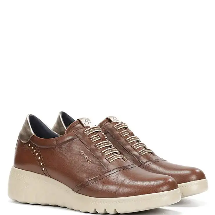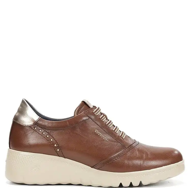 Zapato deportivo elaborado en piel. Plantilla textil extraíble. Cierre con cordones elásticos. Suela de goma EVA con cuña 5 cm de altura. Incorpora tecnología Light.