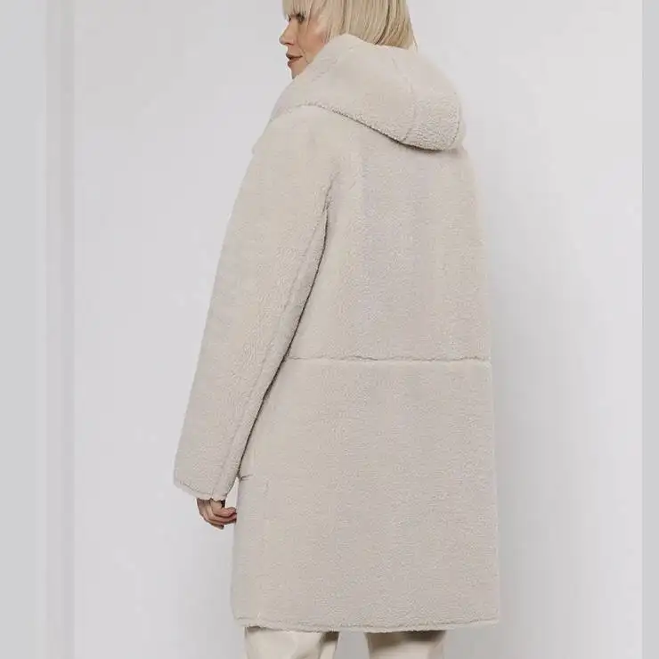 Abrigo medio reversible. Por un lado, ante sintético y por otro borreguito. Cierre con cremallera y botones a presión. Capucha y bolsillos.