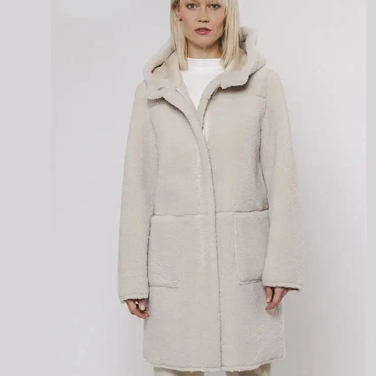 Abrigo medio reversible. Por un lado, ante sintético y por otro borreguito. Cierre con cremallera y botones a presión. Capucha y bolsillos.