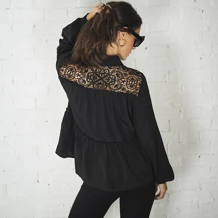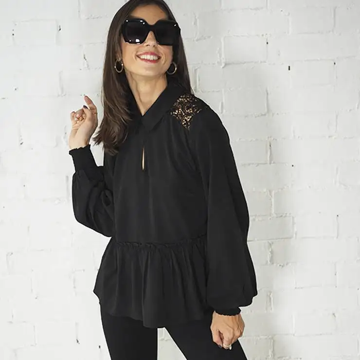 Blusa corte peplum, detalle de elástico en la cintura. Abertura ajustable con lazo en el cuello. Delicado detalle de encaje en los hombros y la parte superior de la espalda.