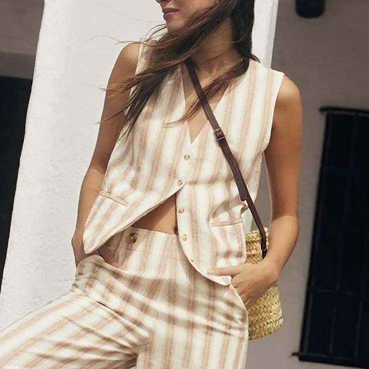 Chaleco de algodón y lino. Diseño de rayas en tonos claros. Escote de pico. Bolsillos delanteros falsos en vivo. Cierre frontal con botones.