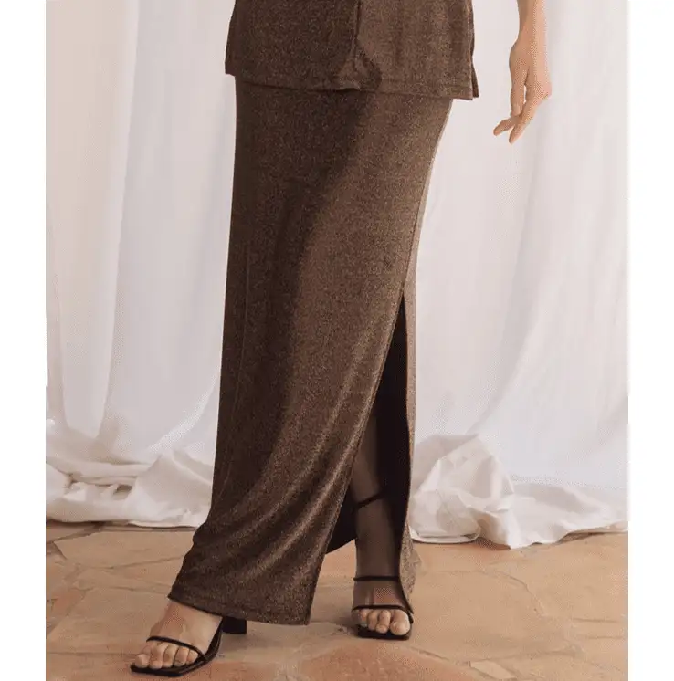 Falda midi confeccionada en mezcla de lúrex dorado y poliamida italiana. Lurex dorado en el exterior mientras que el interior está forrado de poliamida para esculpir delicadamente la figura, creando un look elegante y cómodo. Abertura lateral muy cómoda.
