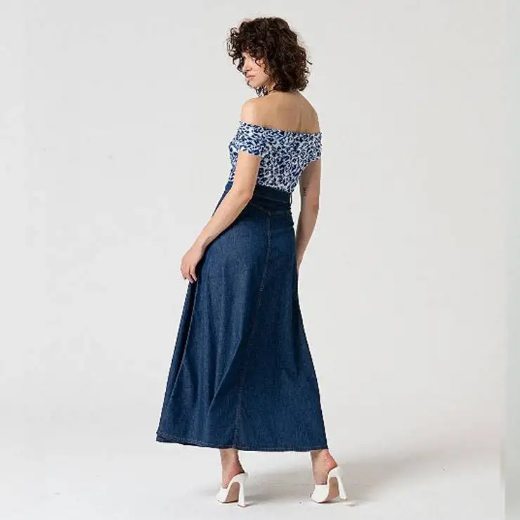 Falda larga elaborada en algodón 100%. Estilo denim con vuelo. Cintura con trabillas. Cierre frontal con botón y cremallera.