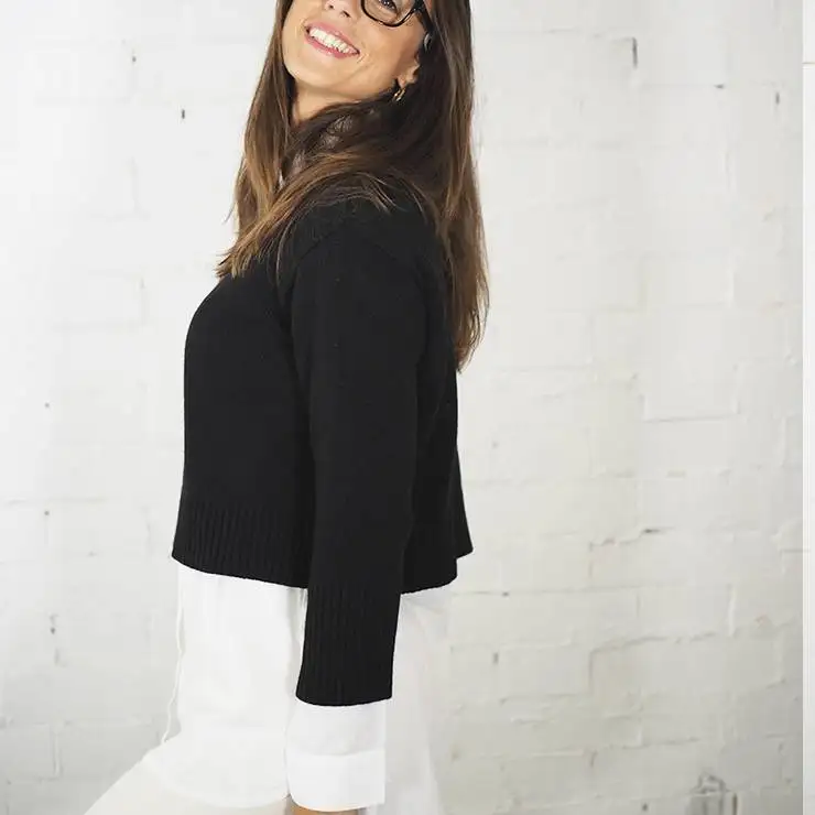 Jersey corto elaborado en mezcla de lana elástica, corte boxy con acabados acanalados. Cuello redondo. Manga larga con sisa caída.