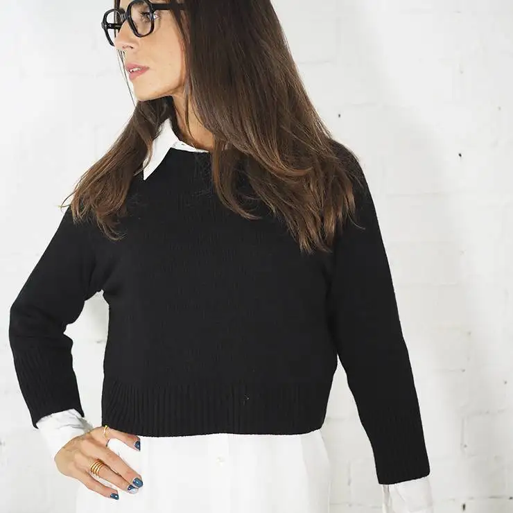 Jersey corto elaborado en mezcla de lana elástica, corte boxy con acabados acanalados. Cuello redondo. Manga larga con sisa caída.