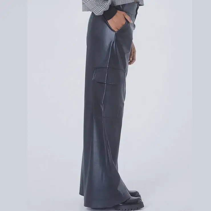Pantalón ancho tipo cargo efecto piel. Cuatro bolsillos, cierre de cremallera y doble botón. Corte estándar.
