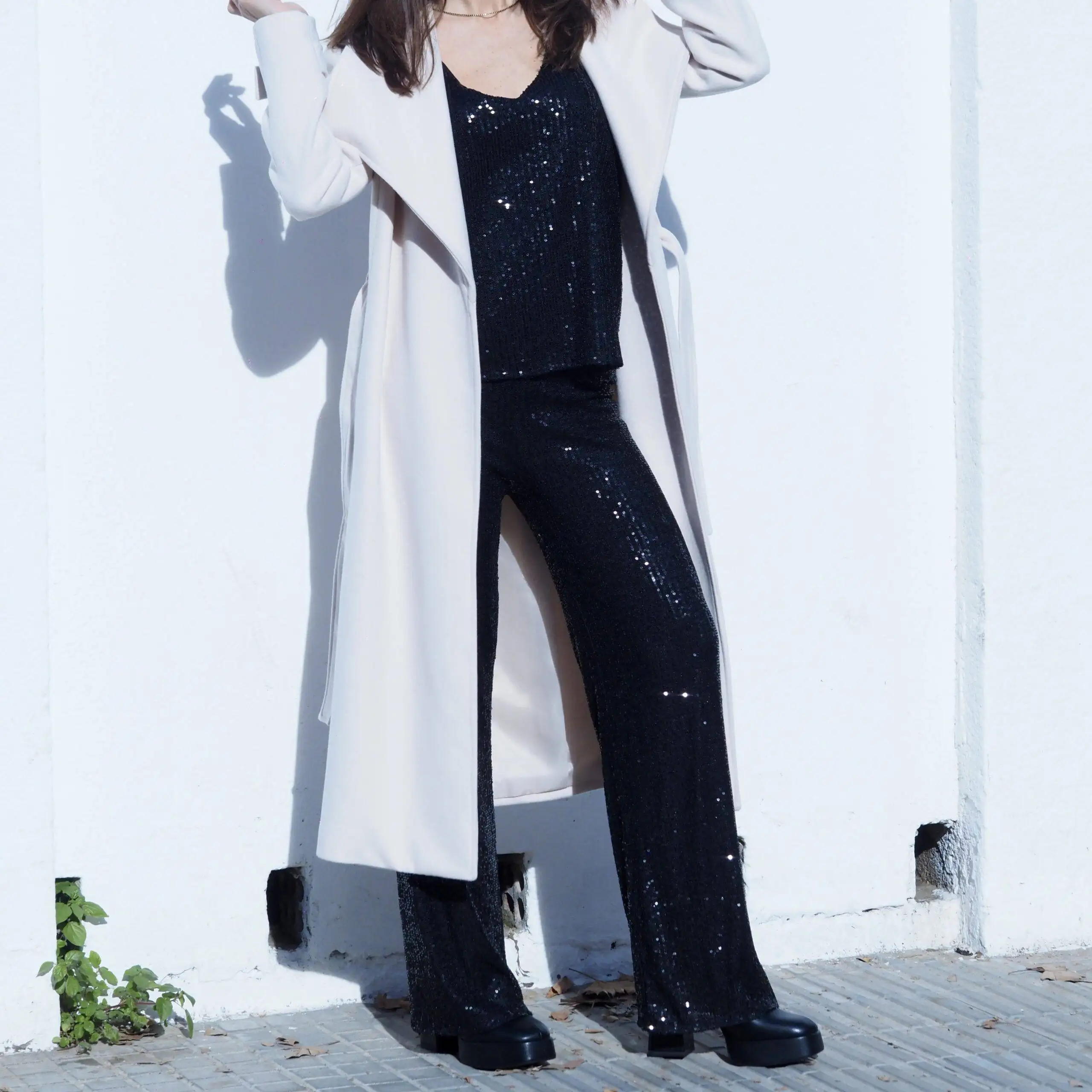 Pantalón de viscosa con acabado de lentejuelas en color negro. Goma en la cintura. Sin cierre. Corte recto. Perfecto para brillar en estas fiestas navideñas y fin de año. Talla única, equivale a una talla 36-38.