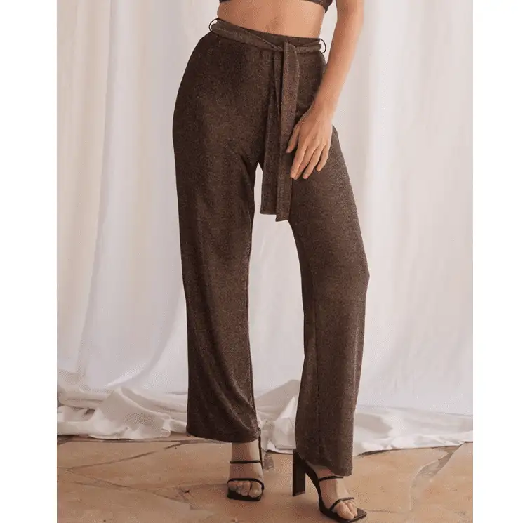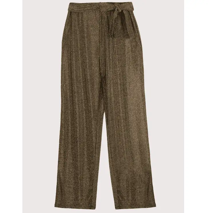 Pantalón largo confeccionado en mezcla de lúrex dorado y poliamida italiana. Lurex dorado en el exterior mientras que el interior está forrado de poliamida un look elegante y cómodo. Corte amplio, cintura alta y cinturón al tono resaltando perfectamente tu figura.