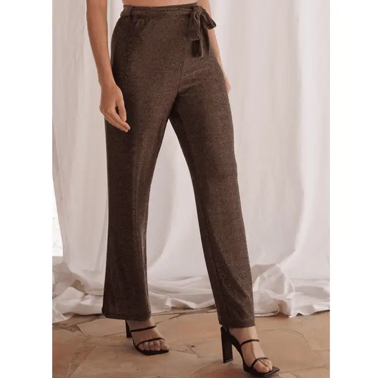 Pantalón largo confeccionado en mezcla de lúrex dorado y poliamida italiana. Lurex dorado en el exterior mientras que el interior está forrado de poliamida un look elegante y cómodo. Corte amplio, cintura alta y cinturón al tono resaltando perfectamente tu figura.