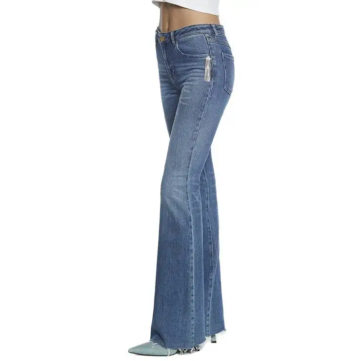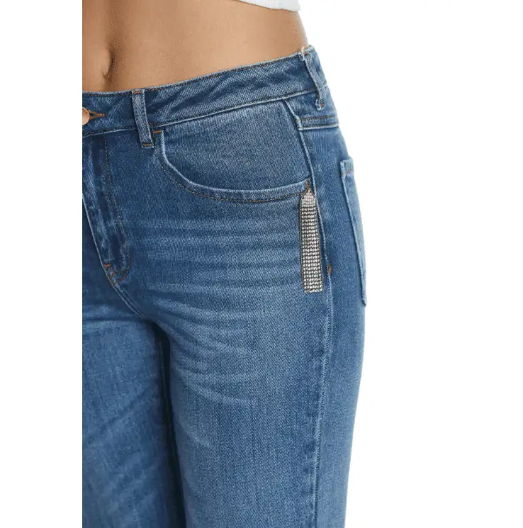 Pantalón tipo tejano acampanado en algodón y elastano. Talle medio, detalle de aplicación strass.