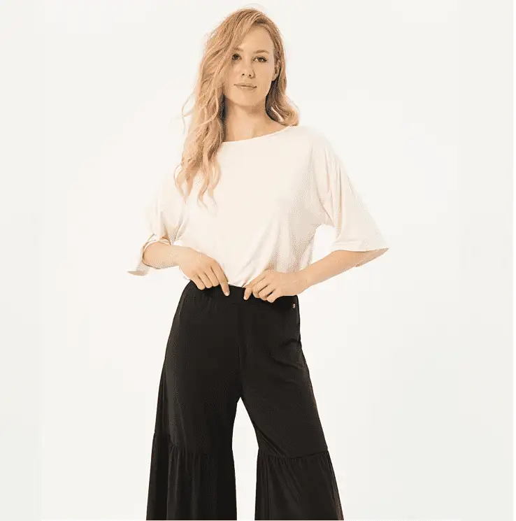 Pantalón largo elaborado en modal, un tejido suave y elástico. Detalle de fruncidos efecto volatne. Sin cierres, cintura elástica.