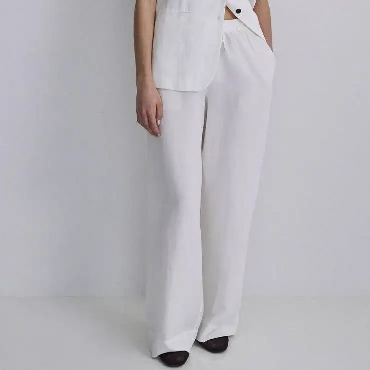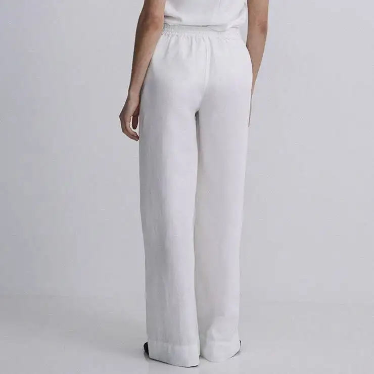 Pantalón largo elaborado en tejido mezcla de lino y tencel. Diseño wide leg. Sin cierre. Cintura elástica con tiras anudables. Dos bolsillos laterales.