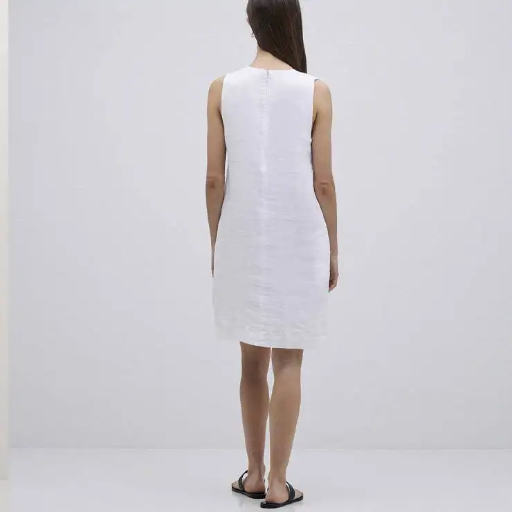 Vestido corto en tejido 100% lino. Tintura Oeko Tex. Diseño recto. Escote cuadrado. Sin mangas. Cierre con cremallera y gancho en la espalda. Dos bolsillos laterales.